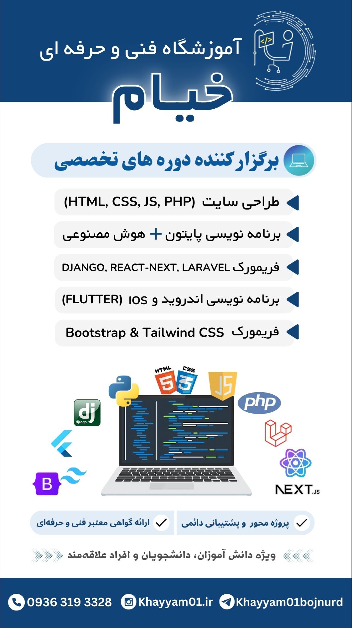 آموزشگاه خیام، جایی برای یادگیری حرفهای در دنیای طراحی وب و برنامهنویسیه! در خیام، دورههای متنوعی رو از پایه تا پیشرفته داریم، از طراحی سایت با HTML، CSS، PHP و JavaScript گرفته تا برنامهنویسی با پایتون، هوش مصنوعی و فریمورکهای پرطرفداری مثل Laravel و React. تمام کلاسها حضوری و کاملاً پروژهمحور برگزار میشن، تا شما بتونید مهارتهاتون رو بهصورت عملی و کاربردی یاد بگیرید. اگر دنبال یه یادگیری صمیمانه و حرفهای هستید، خیام یه انتخاب عالیه!